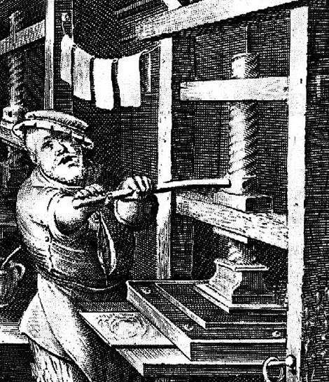 Johannes Gensfleisch, mieux connu sous le nom de Gutenberg, est né vers 1397, à Mayence (Allemagne). Nous le trouvons en 1444 à Strasbourg, où il entreprend des recherches sur le système d’imprimerie à caractères mobiles. Il fait aussi construire une presse en bois qui ne donnera toutefois pas entière satisfaction.