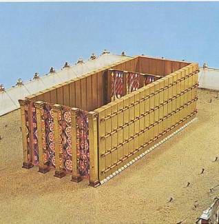 recouvrait le tabernacle (Exode 26:13) selon l’illustration suivante. Par contre, dans cette dernière représentation, nous ne voyons pas de justification pour la tension des deux couvertures extérieurs en s’écartant des ais.