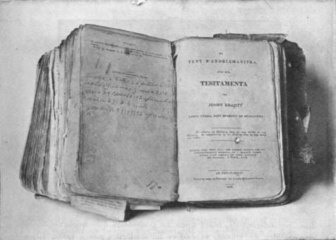 Des exemplaires de la Bible furent remis aux indigènes. Ceux qui les recevaient savaient fort bien qu’en les recevant ils risquaient leur vie. Quand les missionnaires, expulsés, quittèrent l’île, en juillet 1836, il restait encore un stock de soixante-dix Bibles. Les missionnaires enterrèrent ces soixante-dix Bibles et en indiquèrent la cachette à quelques-uns de leurs convertis. Ce fut là, pour de longues années, le dépôt biblique des chrétiens malgaches. Ces Bibles, comme on l’a dit, furent le combustible qui, pendant plus d’un quart de siècle de persécution, alimenta le feu sacré à Madagascar. Plusieurs de ces Bibles existent encore. On en voit une à la bibliothèque de la Société biblique britannique.