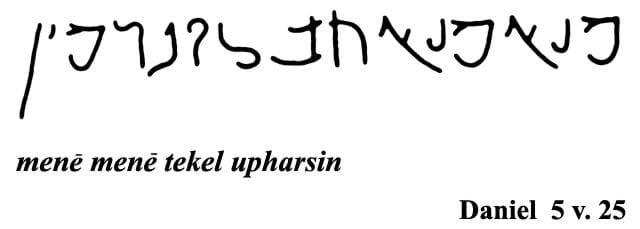 5:25 Mene, Mene, Thekhel, Upharsin : Compté, compté, pesé et divisé. Dieu t’as pesé et tu as été trouvé manquant de poids