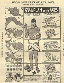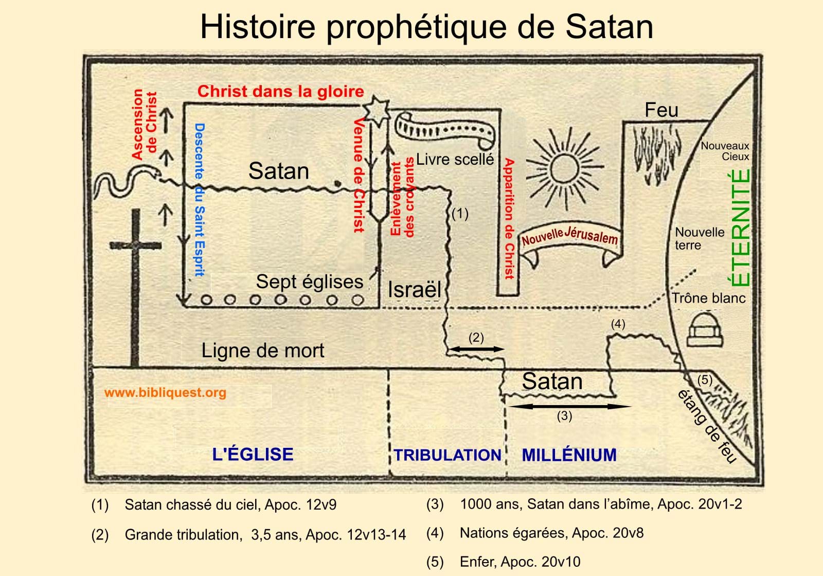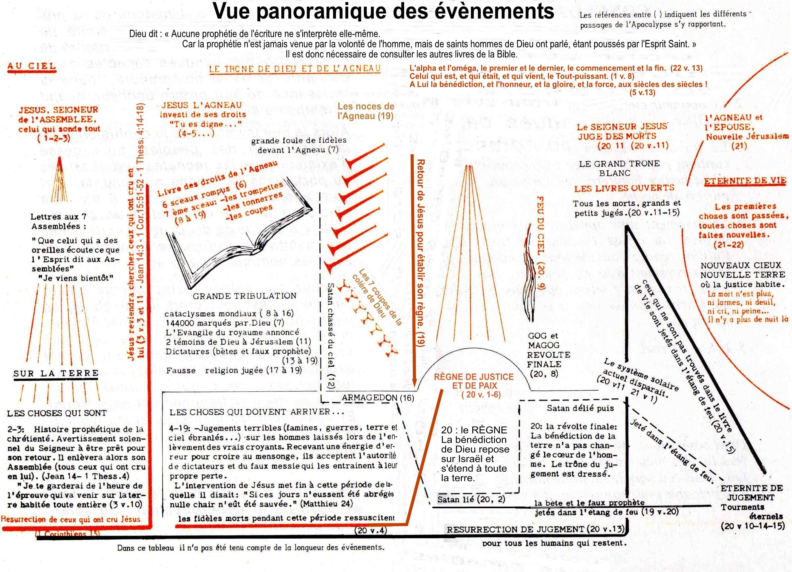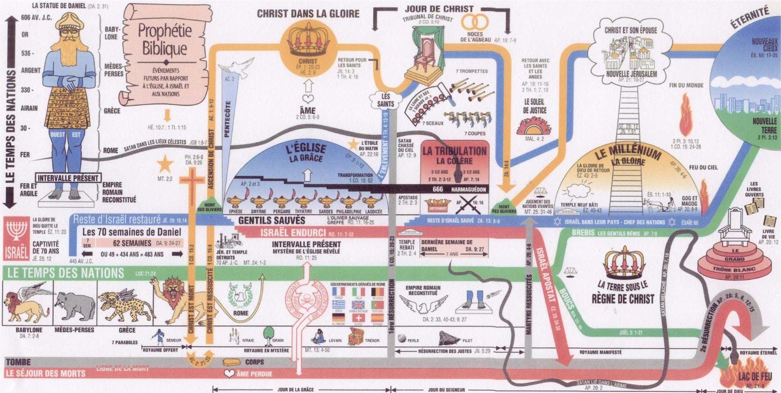 Vues détaillées sur des points particuliers, parenthèse de l’Église Israël + Israël comme sujet traité sur une page à part Les Nations (Gentils ou Goïm), le temps des nations Empire romain Babylone, Oecuménisme Les derniers jours – La Grande Tribulation, Armaguédon, l’Assyrien Antichrist, Apostasie Royaume de Christ ou Millénium Jugements de la fin, Fin du monde, L’état éternel, le Paradis