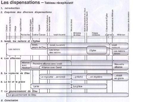 - Une « dispensation » signifie simplement : une certaine période de temps pendant laquelle certains principes directeurs s’appliquent de la part de Dieu à l’égard des hommes [WK dans Lectures on Matthew, ch. 12 p. 190] ; Tableau synoptique des dispensations [JA Monard ; 163 Ko]